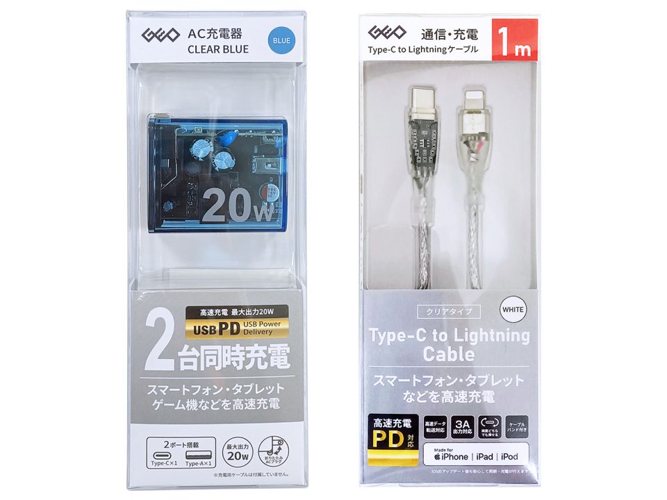 クリアタイプ AC充電器”GRMT-2ACP20”新色、クリアタイプ Type-C to Lightningケ…