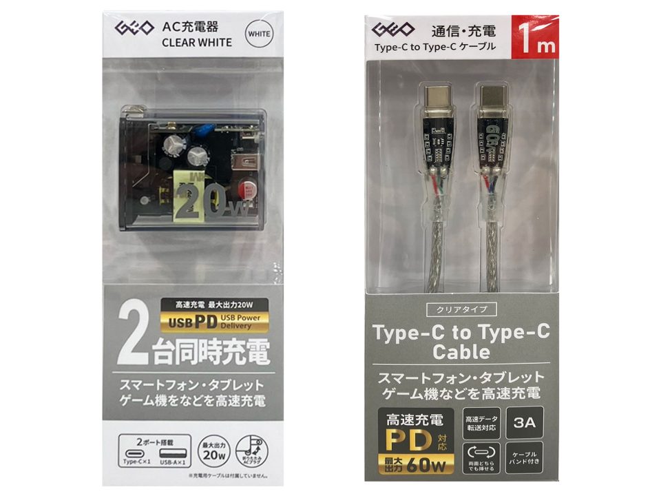 クリアタイプ AC充電器”GRMT-2ACP20”、Type-C to Type-C通信・充電用ケーブル”GR…