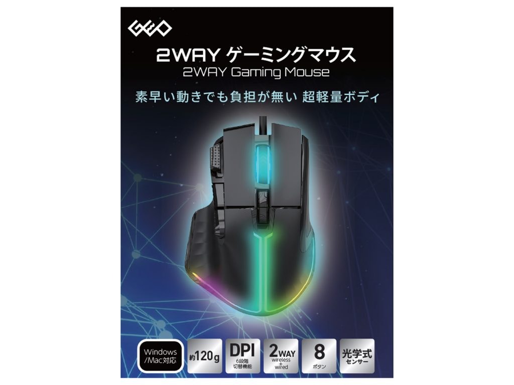 今回新たに販売するゲオ限定商品の「2WAY ゲーミングマウス」は、ワイヤレス接続と有線接続の両方で使用できるゲーミングマウスです。約120gの軽量モデルで、光学式センサーを搭載しています。DPI(解像度)は6段階で、最大12000DPIまで切り替え可能です。連射ボタンを含む8つのボタンと、選べるRGBライティングを備え、WindowsとMacの両方に対応しています。価格は、税抜2,980円(税込3,278円)とお求めやすい価格を実現しました。