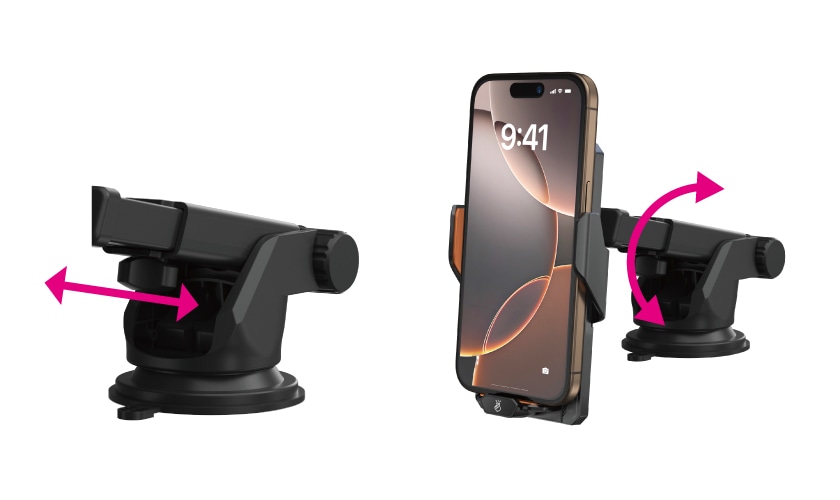 伸縮アームで角度や長さを調整できるので、見やすい位置にスマートフォンを設置することができます。ホルダーの向きは360度調整することができるので、スマートフォンを縦置きでも横置きでも、自由に切り替えることができます。