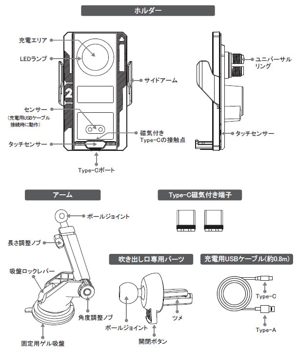 | 付属品 | ホルダー、伸縮アーム、吹き出し口専用パーツ、Type-C磁気付き端子(2個)、充電用USBケーブル(約0.8m) |
