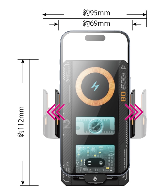 ホルダーは横の長さを調節可能です。幅 約69~95mm以内のスマートフォンを取り付けることができます。