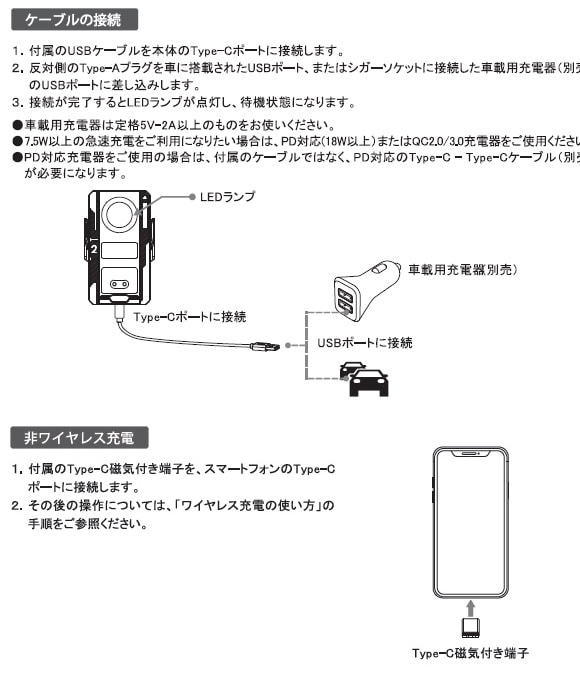 ※ワイヤレス充電対応機器では、「Type-C磁気付き端子」を使用しての充電は行わないでください。本端子を使用すると、機器のワイヤレス充電機能が正常に動作しなくなるおそれがあります。