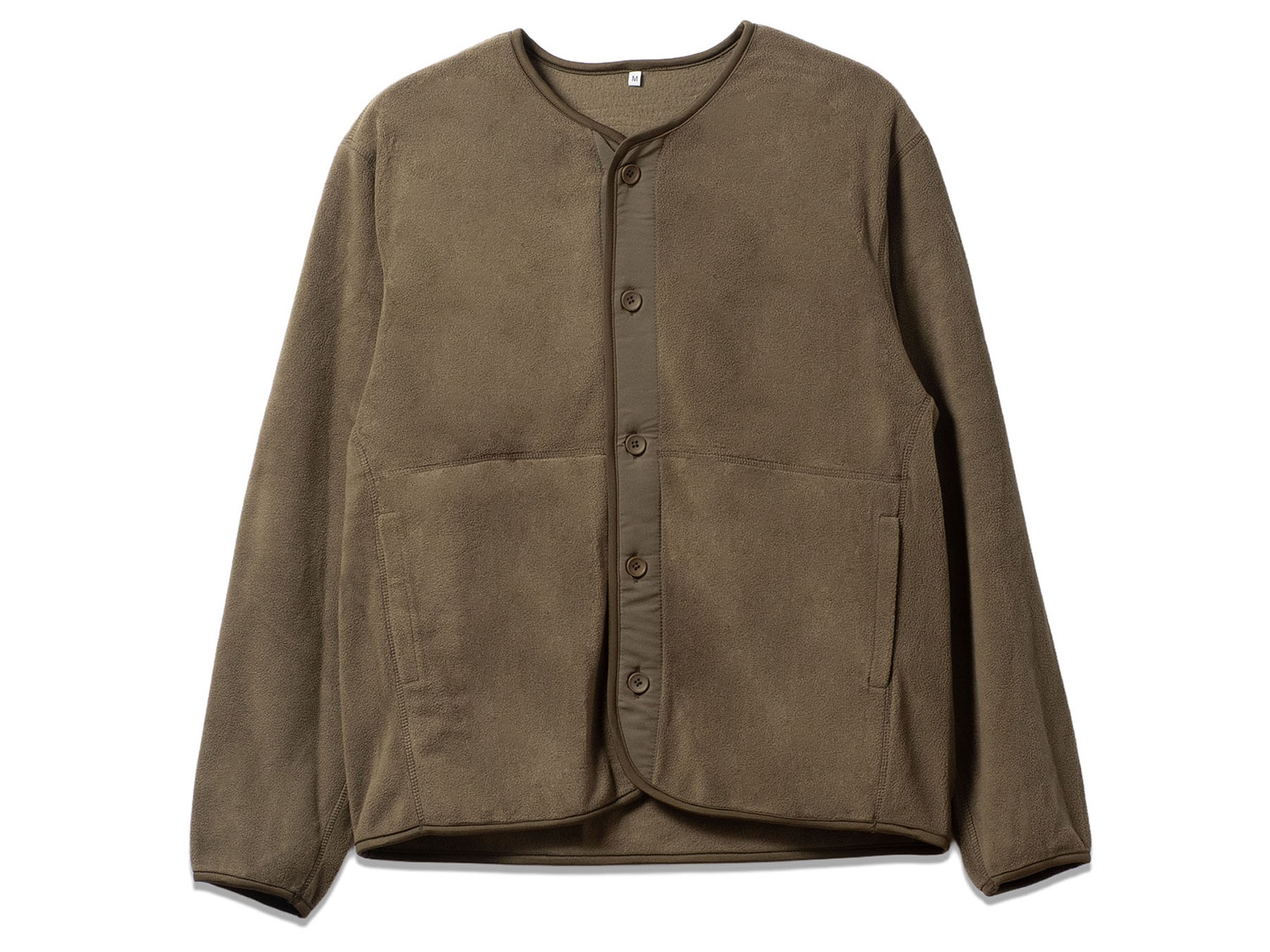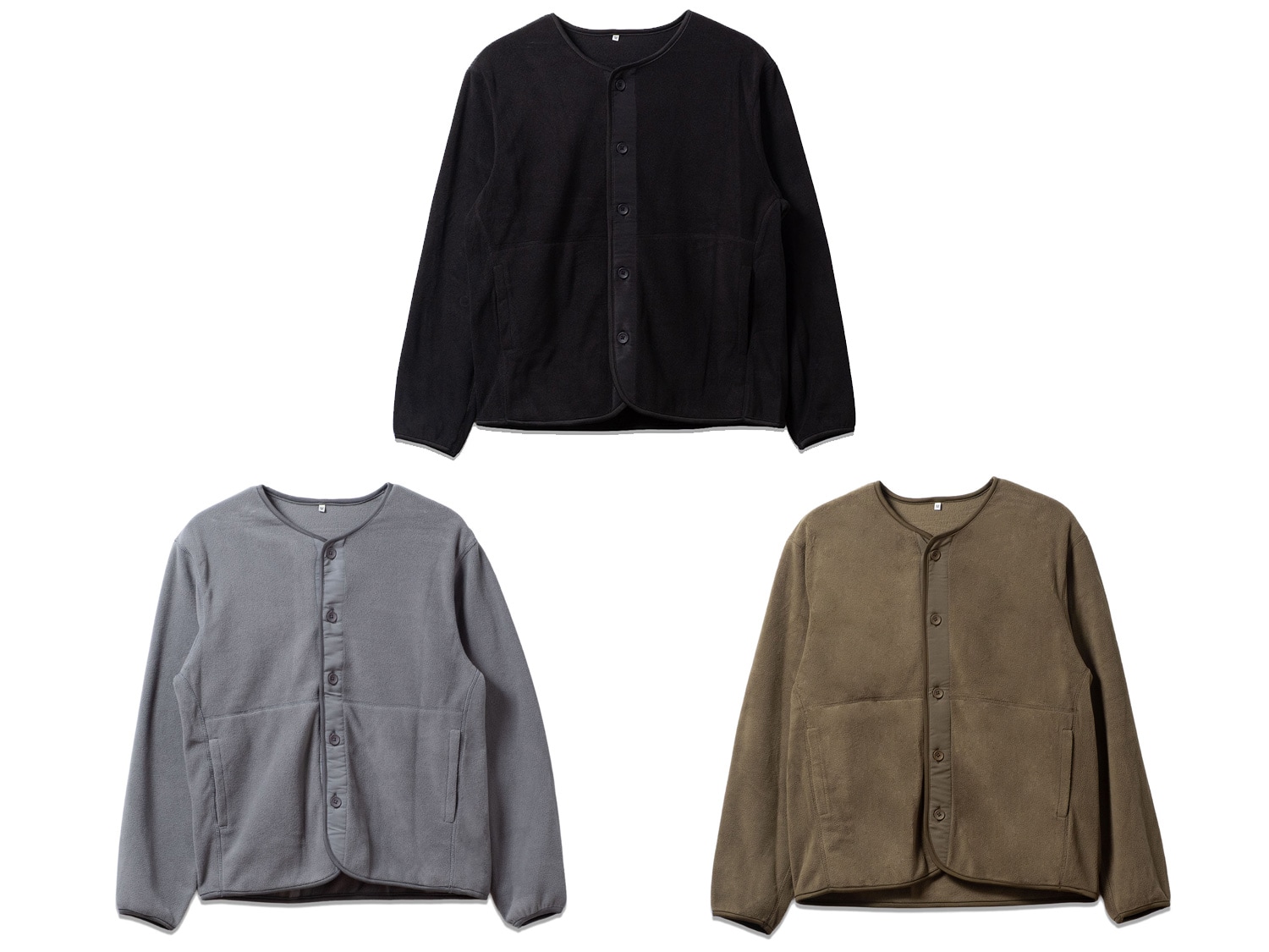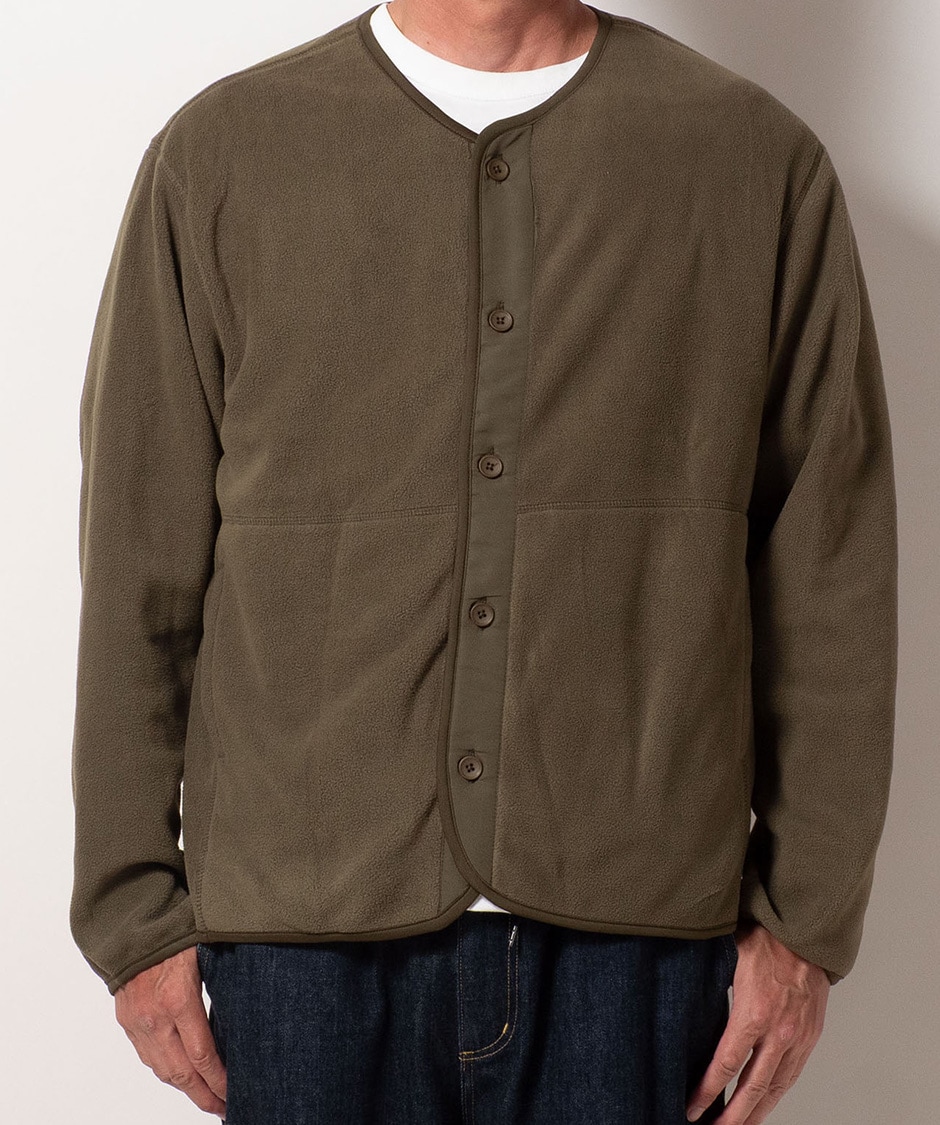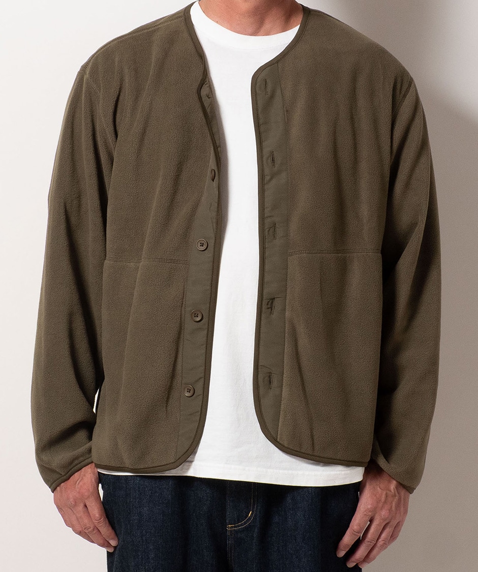 襟、袖、裾部分に風の侵入を防ぐため、パイピングが施されています。ややゆったりとしたシルエットで、抜け感のある着こなしが叶うノーカラージャケットです。前後差がある丈感が動きのある印象を与え、レイヤードにも最適です。