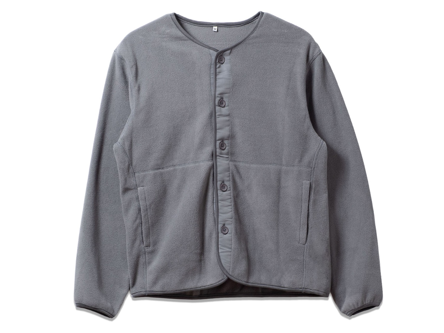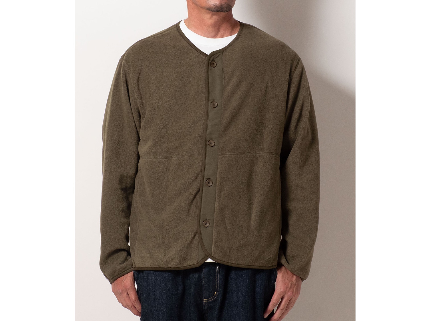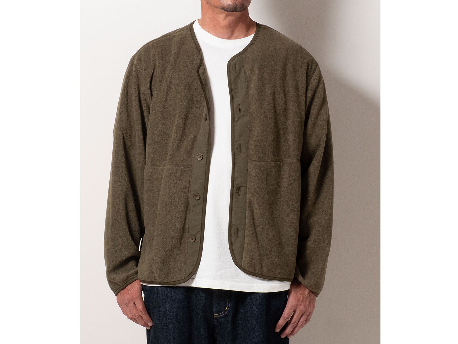 襟、袖、裾部分に風の侵入を防ぐため、パイピングが施されています。ややゆったりとしたシルエットで、抜け感のある着こなしが叶うノーカラージャケットです。前後差がある丈感が動きのある印象を与え、レイヤードにも最適です。