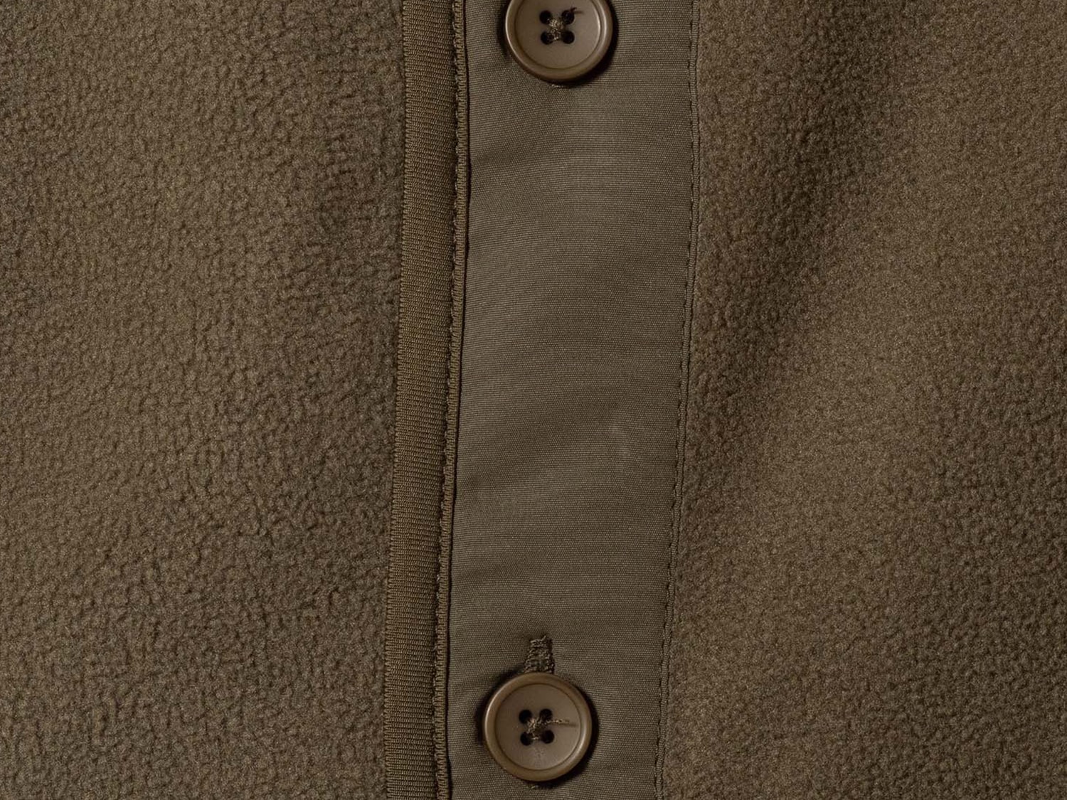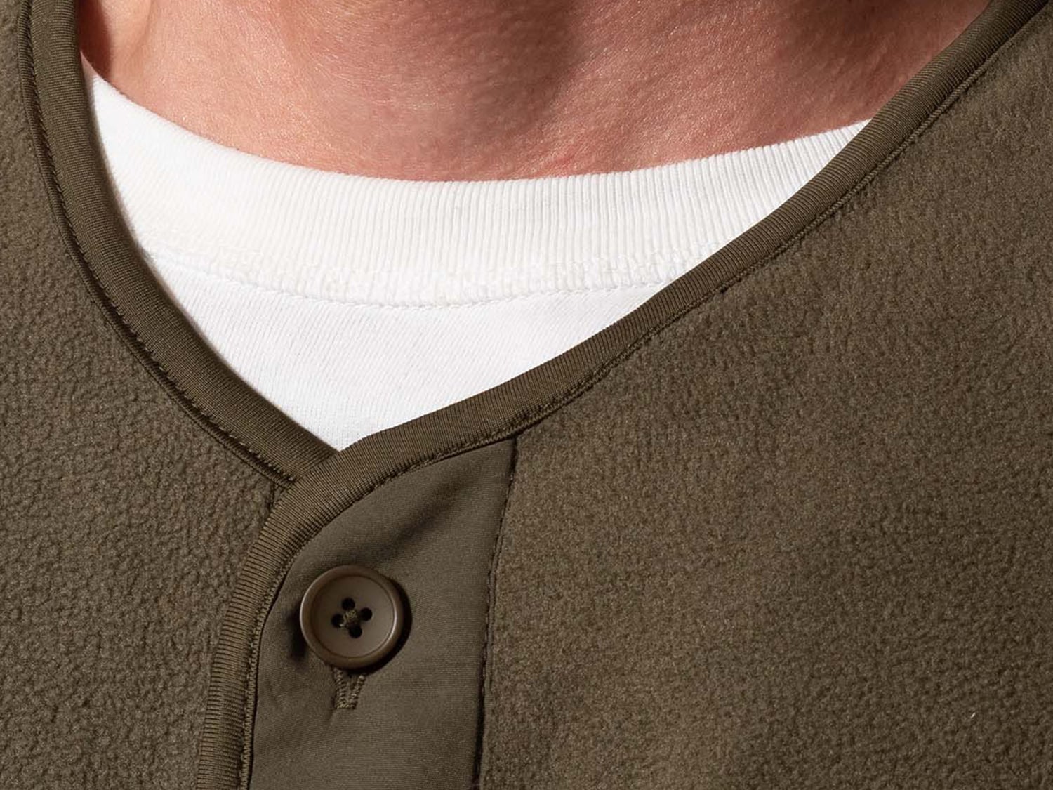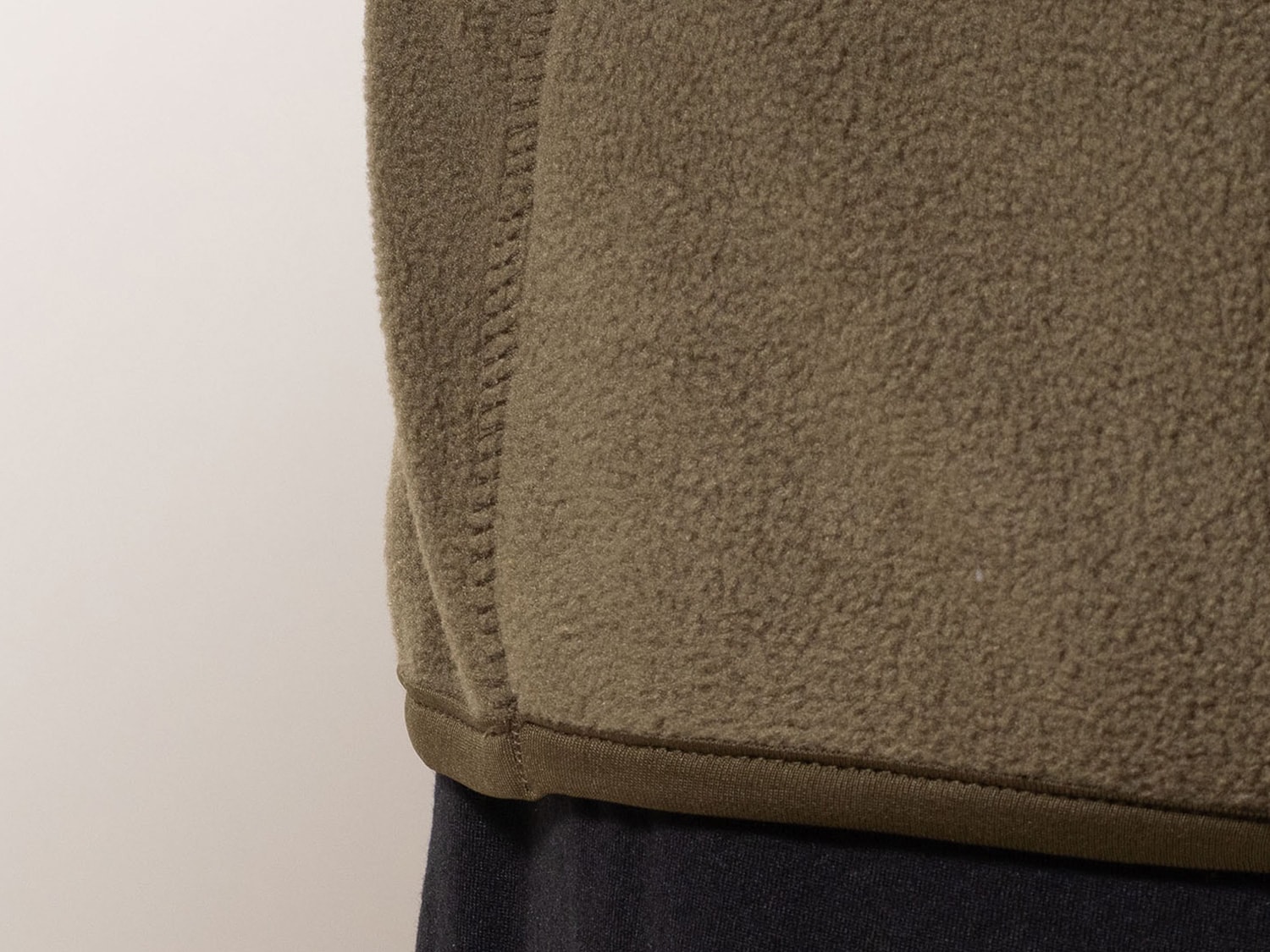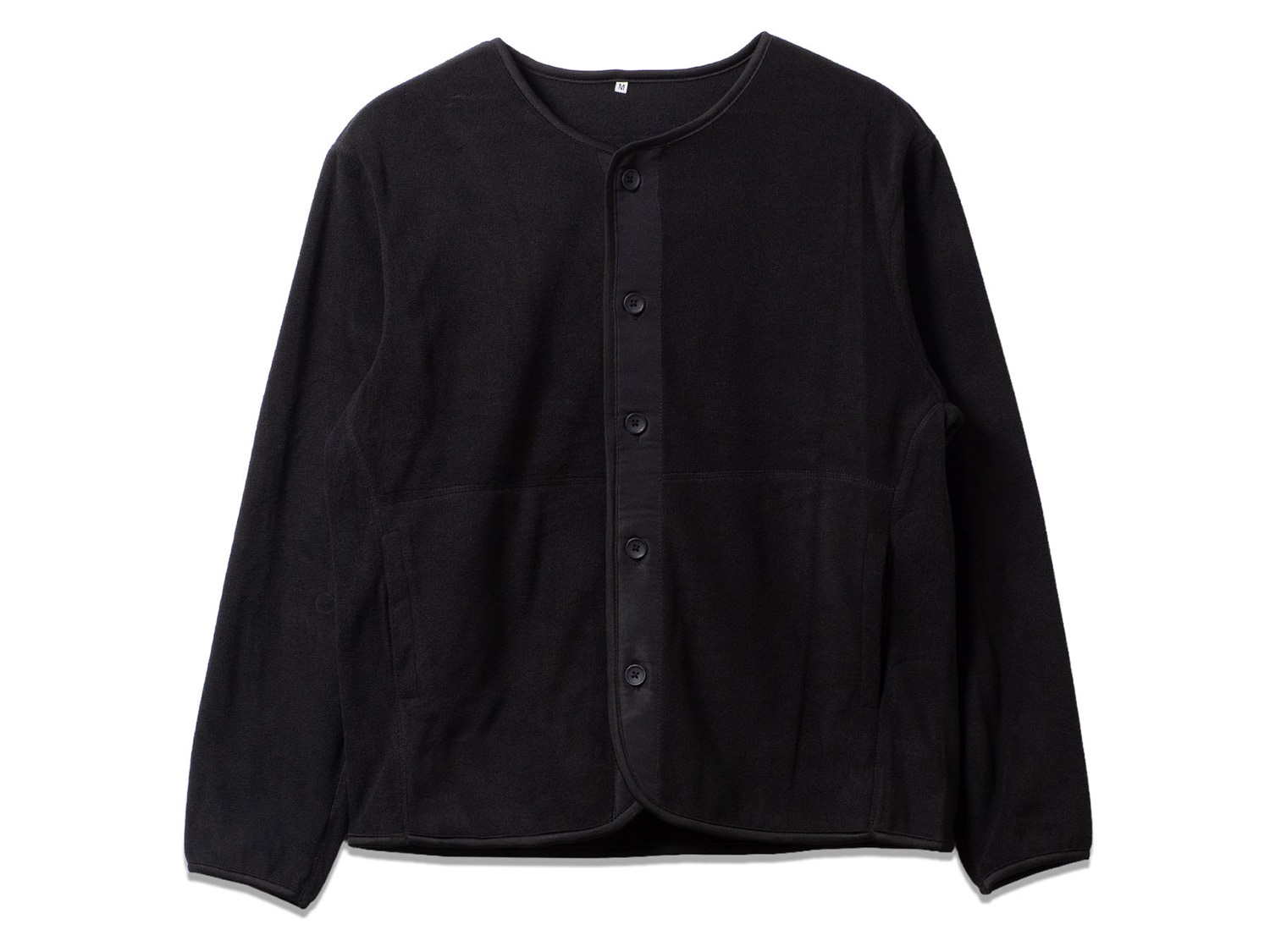 襟、袖、裾部分に風の侵入を防ぐため、パイピングが施されています。ややゆったりとしたシルエットで、抜け感のある着こなしが叶うノーカラージャケットです。前後差がある丈感が動きのある印象を与え、レイヤードにも最適です。