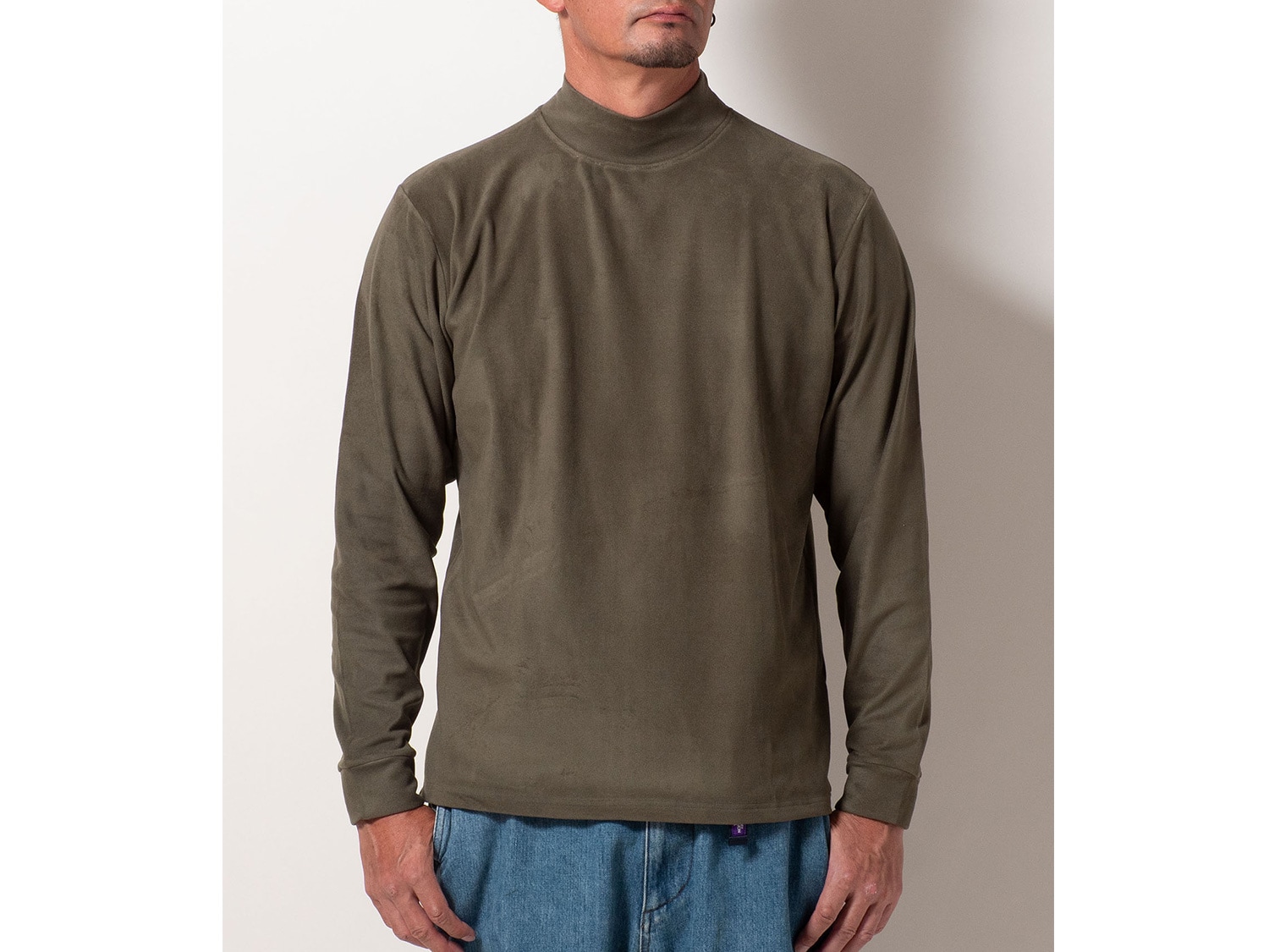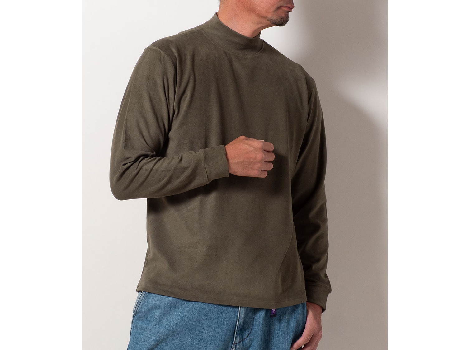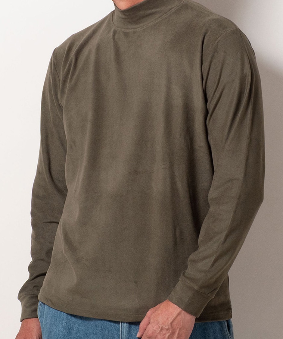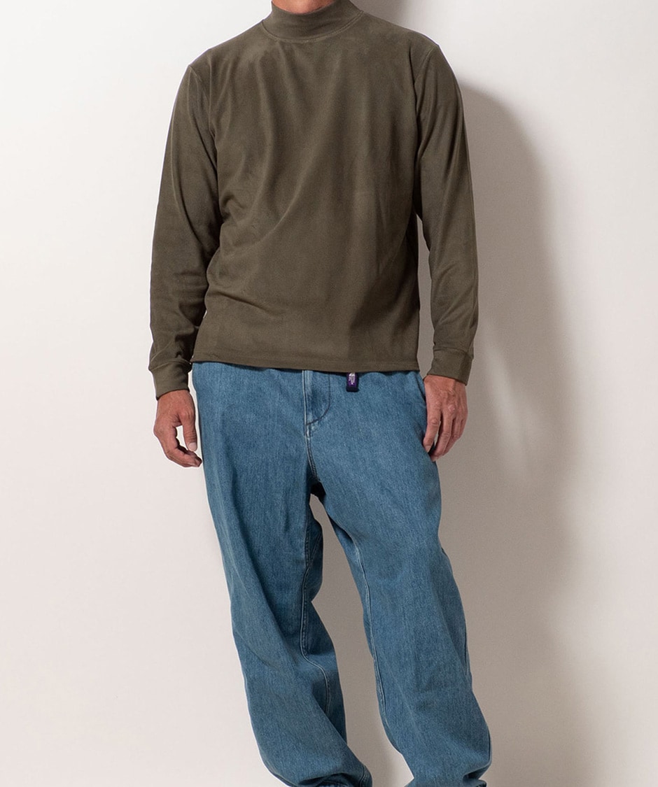 フリースの暖かい素材にポリウレタンを入れて伸びる素材で着用した時の肌触りにこだわった、ソフトなリタッチにしています。シンプルなモックネックなので、インナーとしての着回しも抜群です。