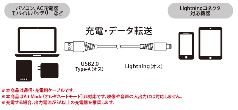 最大2.4A出力。急速充電、データ転送に対応しています。Lightningコネクタ搭載のiPhone・iPad・iPodの充電とデータ転送が可能です。安心のMFi(Made for iPhone/iPad/iPod)認証品で、iOSのアップデート後も安心して同期・充電が行えます。
