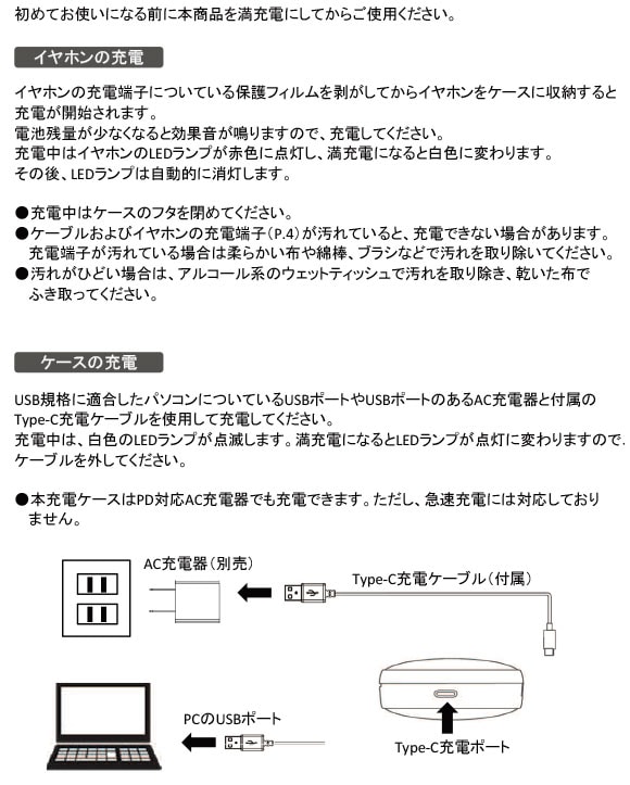 ①ご使用中やご使用後にイヤホン本体へ汗や水滴が付着している場合、汗や水滴を確実に拭き取り、乾いた状態で充電をしてください。(水や汗の侵入防止及び錆等による故障防止のため)