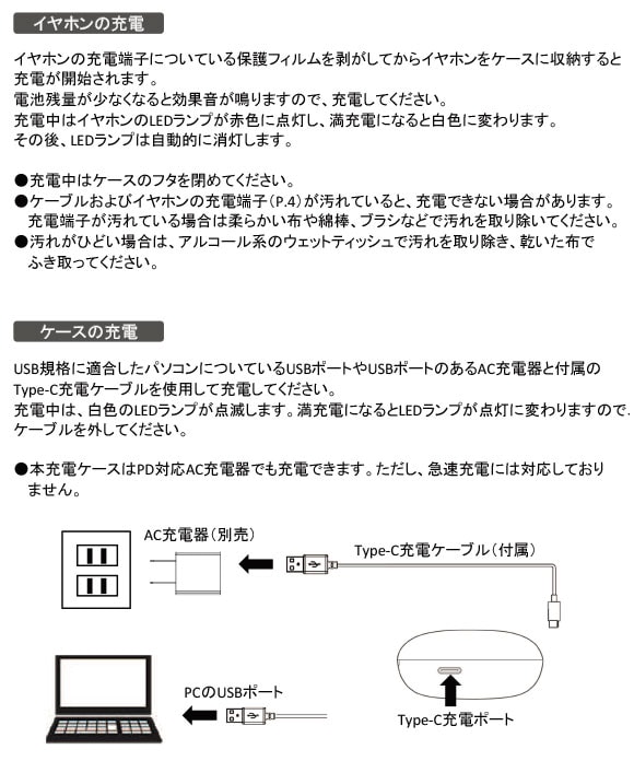 ①ご使用中やご使用後にイヤホン本体へ汗や水滴が付着している場合、汗や水滴を確実に拭き取り、乾いた状態で充電をしてください。(水や汗の侵入防止及び錆等による故障防止のため)