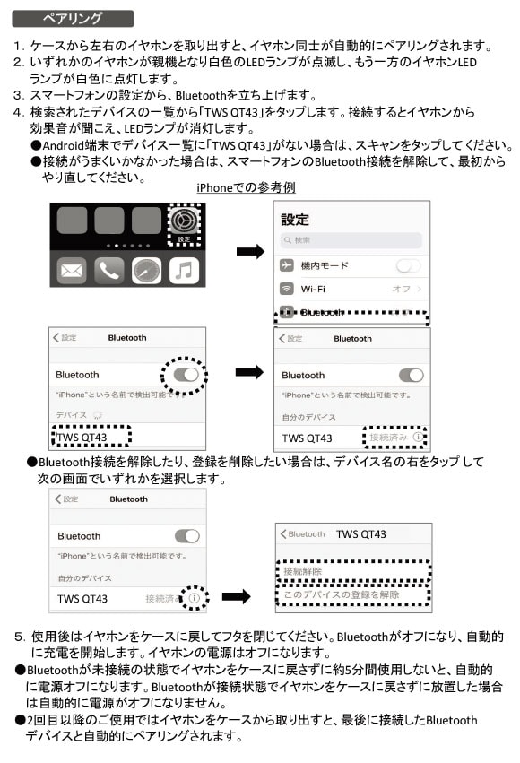 商品仕様 型番 GRFD-TWS QT43 商品名 完全ワイヤレスイヤホン カラー 2色:ブラック(BK)、ミルクホワイト(MWH) JANコード BK:4582794735437