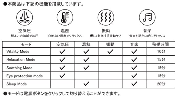 お好みに合わせて5つのモードから選択することができます。心地よい振動や温度で、休日やおやすみ前に目元をリフレッシュできます。ベルトの長さを調整できるので、男女問わずご使用いただけます。