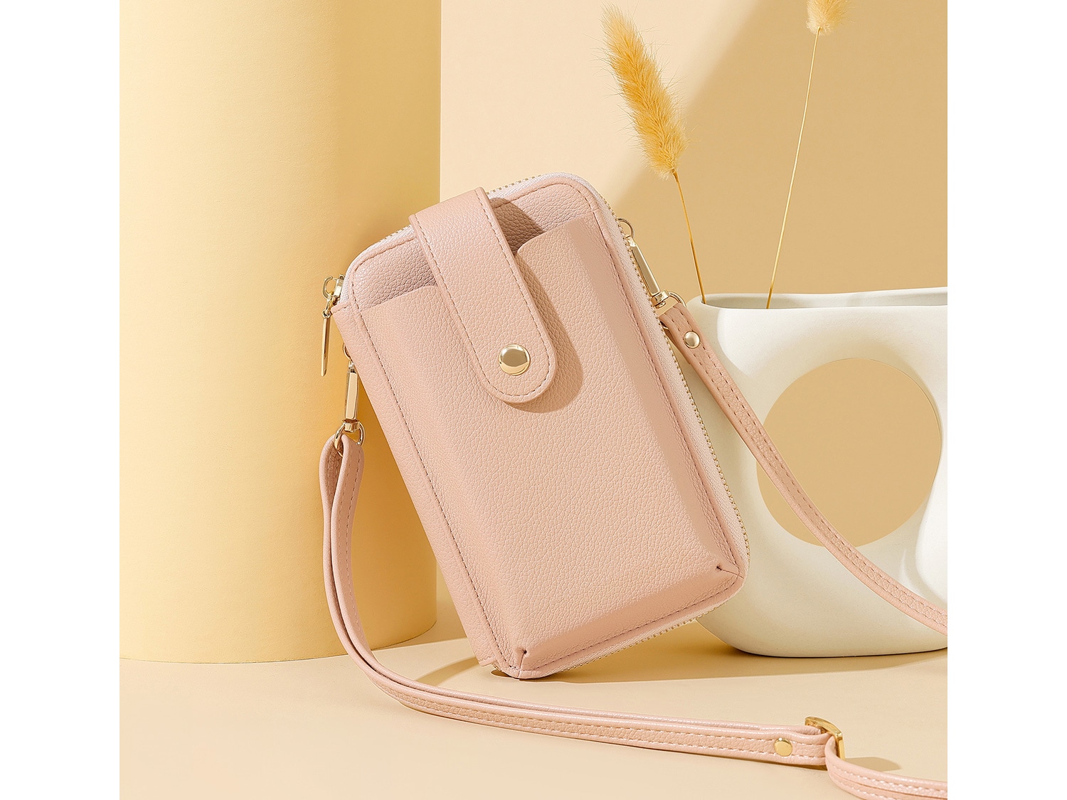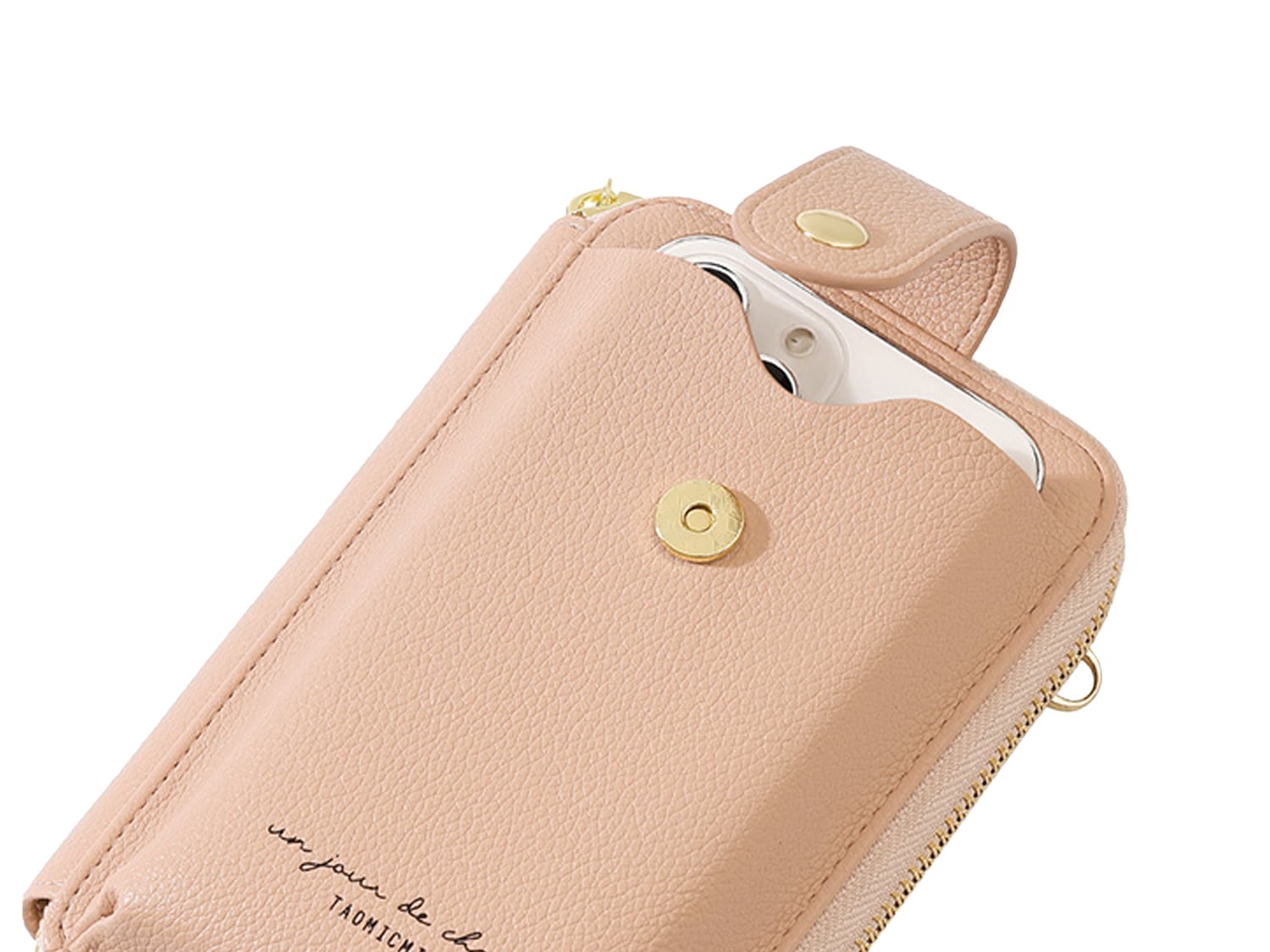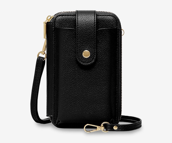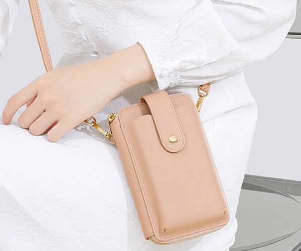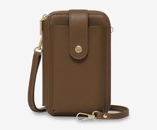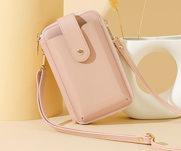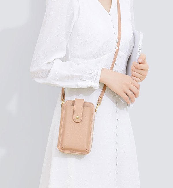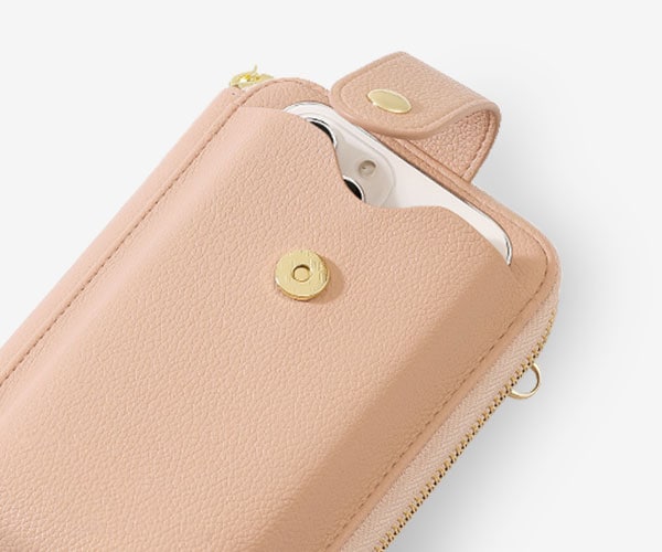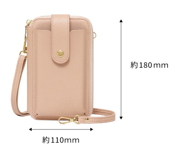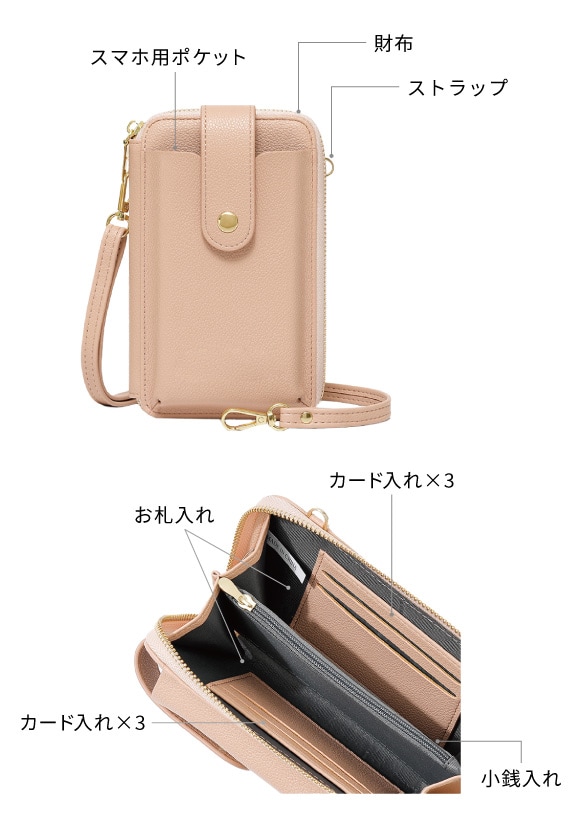 ちょっとしたお出かけに便利な財布機能がついたスマホポシェット。スマホやカード、小銭、お札、鍵など、最小限の荷物を持ち歩きたい時に便利です。旅行など荷物の多いときに、メインバッグとの2個持ちもおすすめです。取り外し可能なショルダーストラップ付きで、肩掛けや斜め掛けにすることができます。シンプルなデザインで、様々なコーデに合わることができます。