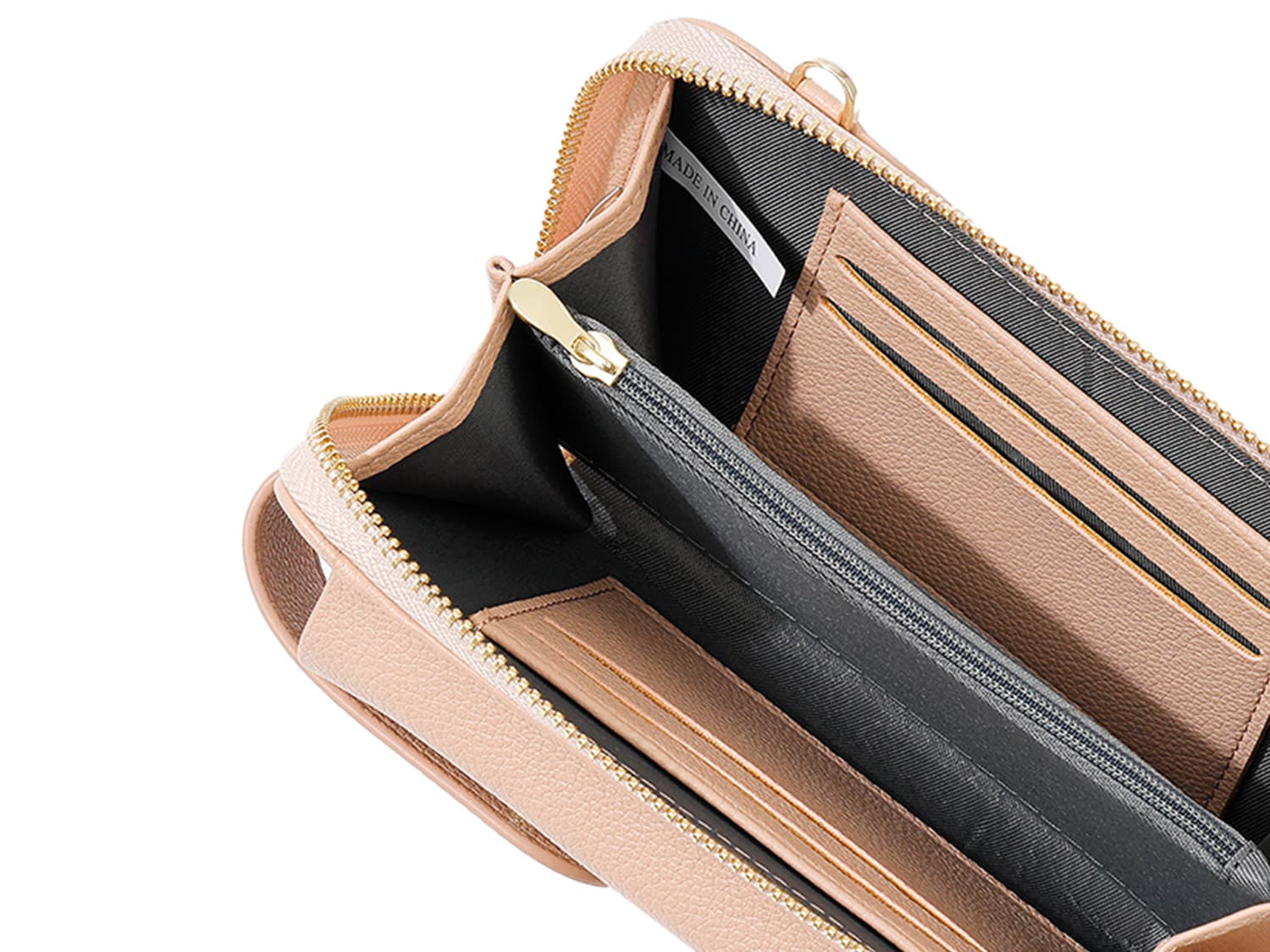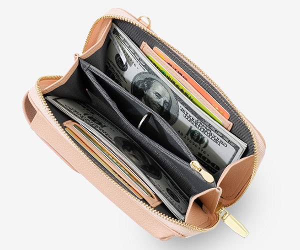 スマホ用ポケット×1、カード入れ×6、小銭入れ、お札入れ付きで、スマホとお金、カード類などを分けて収納することができます。財布を持ち歩く必要がないので、最低限の荷物でお出かけすることができます。