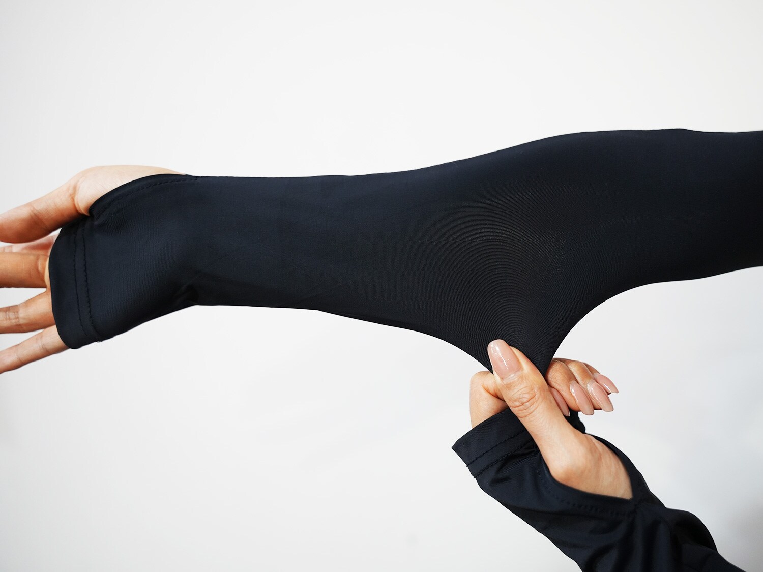長さ56cmのロングタイプで二の腕までかくれます。親指が出せる指穴付きなのでスマホを触るときに外す必要はありません。