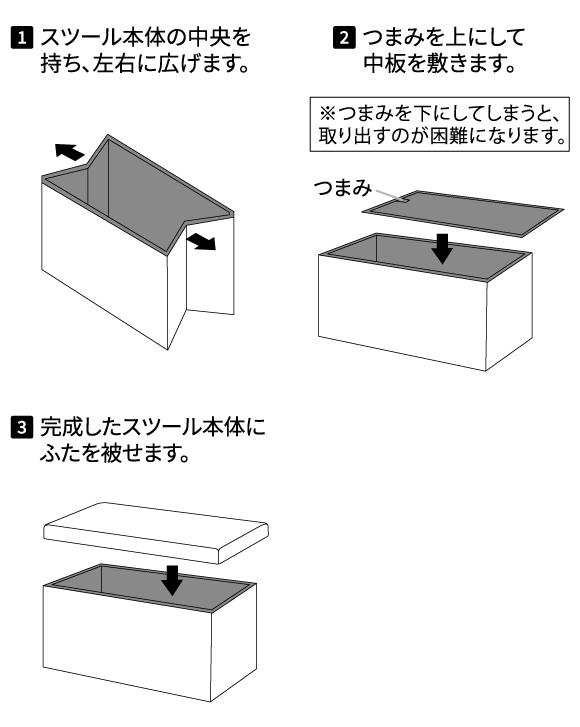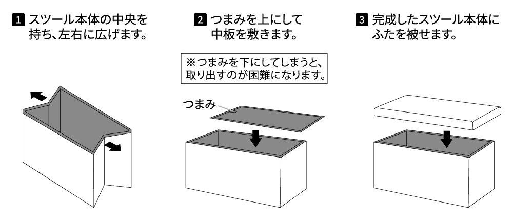 工具不要で組み立て簡単。折り畳み式のため、使用しないときにはコンパクトに収納でき、使いたい時だけサッと組み立てて、スツールや収納ボックスとして活用することができます。