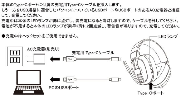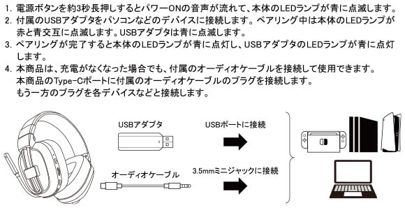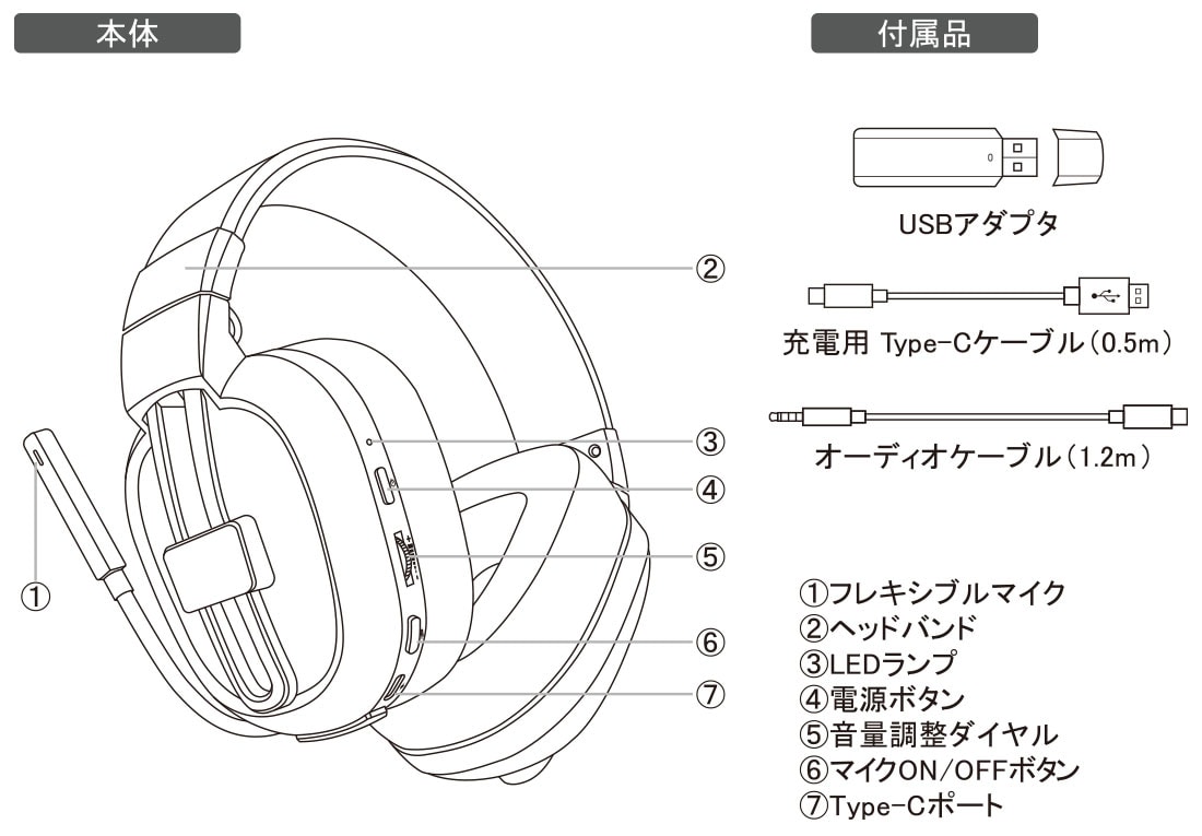 | 付属品 | USBアダプタ(Type-A)、充電用ケーブル(Type-A to Cケーブル)(約0.5m)、オーディオケーブル(約1.2m) | |