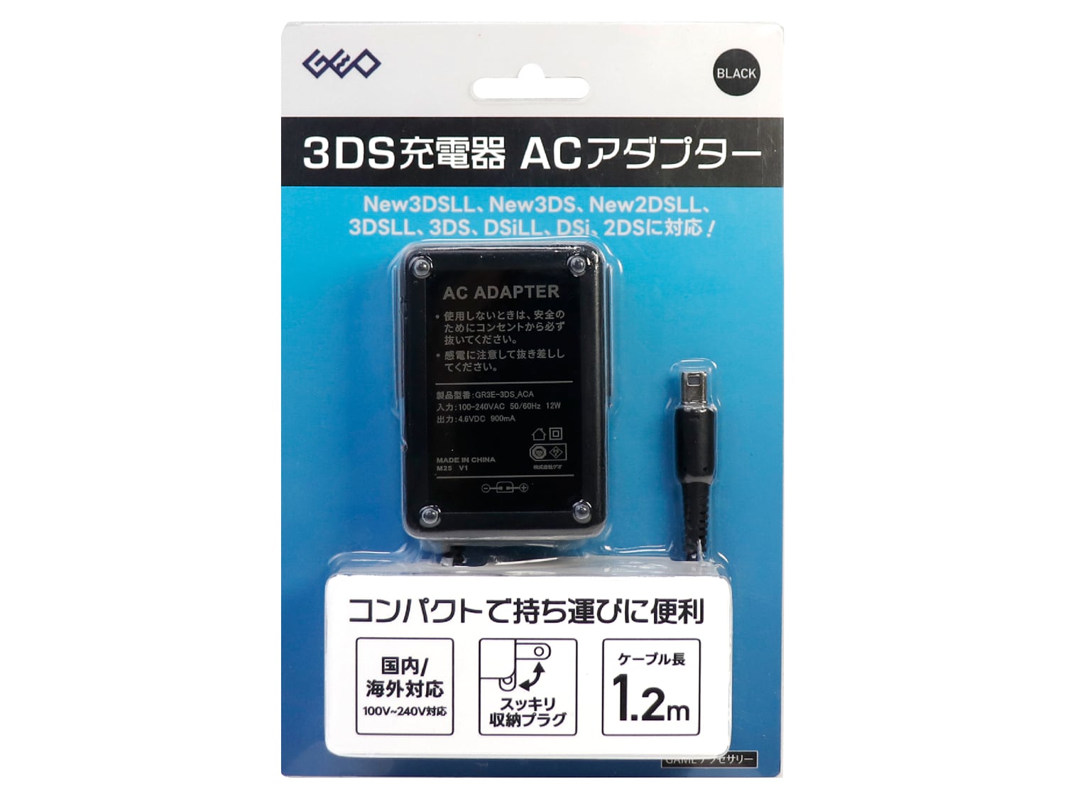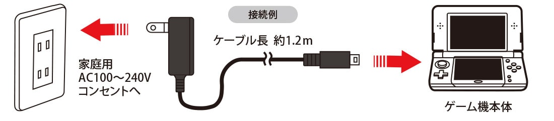 New3DSLLからDSiまでの幅広い機種を充電可能で、収納式プラグによるコンパクト設計と約1.2mのケーブルを備え、国内・海外を問わず100V〜240Vの電源環境でそのまま使用できるACアダプターです。