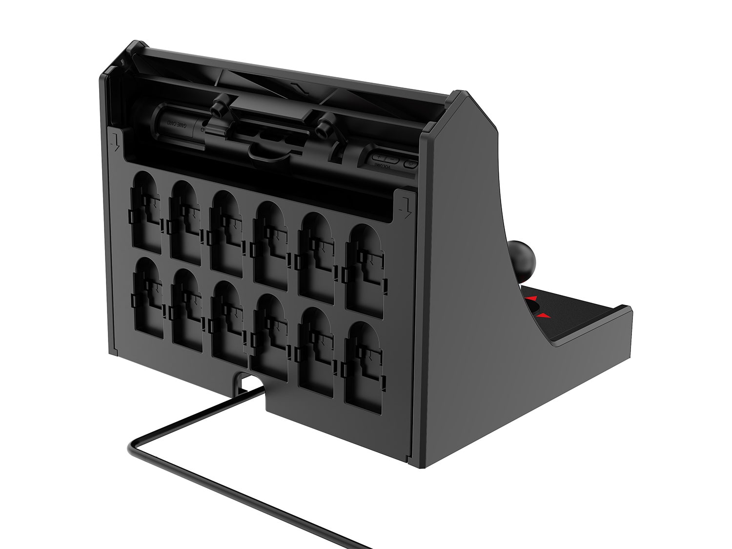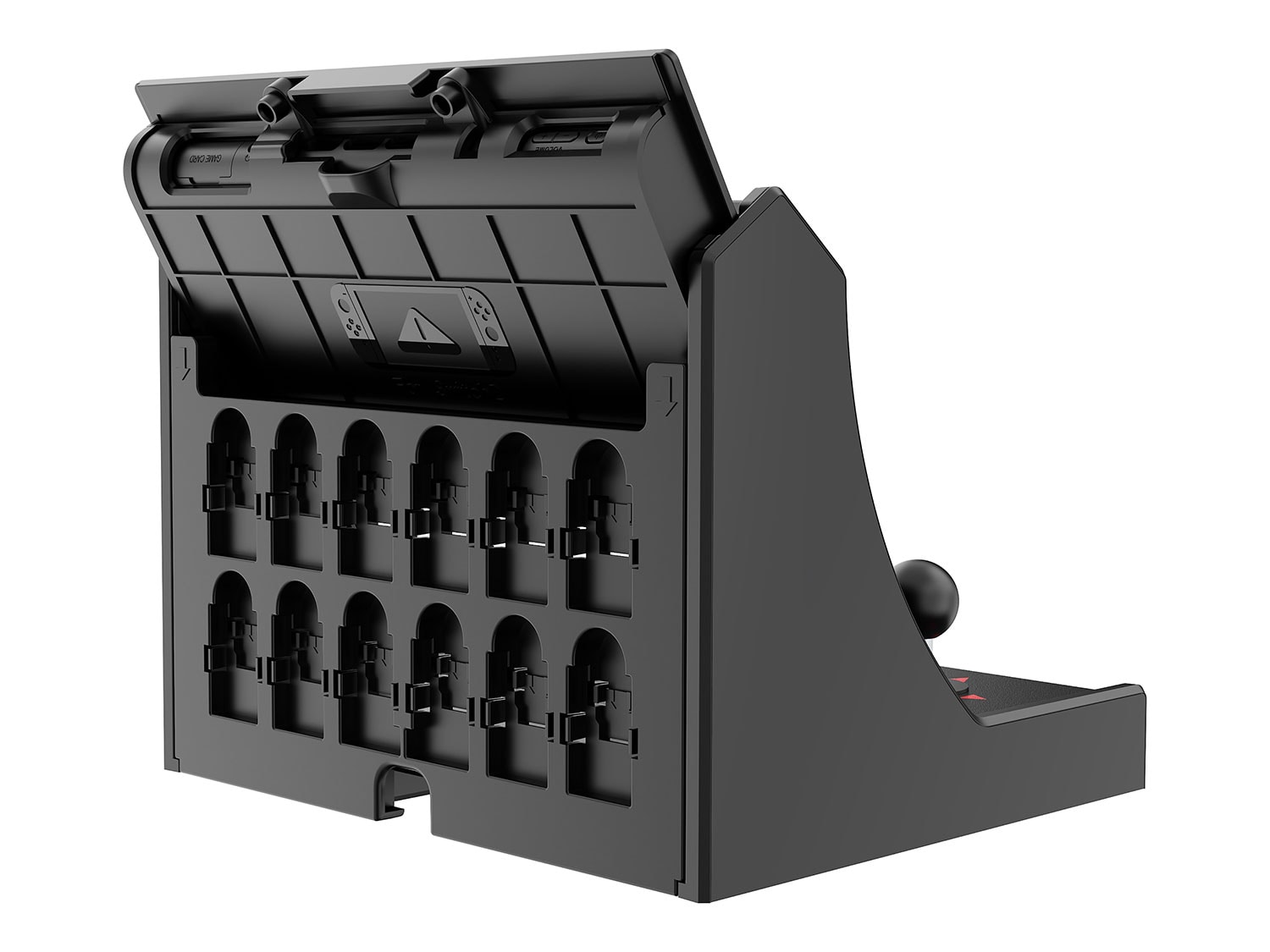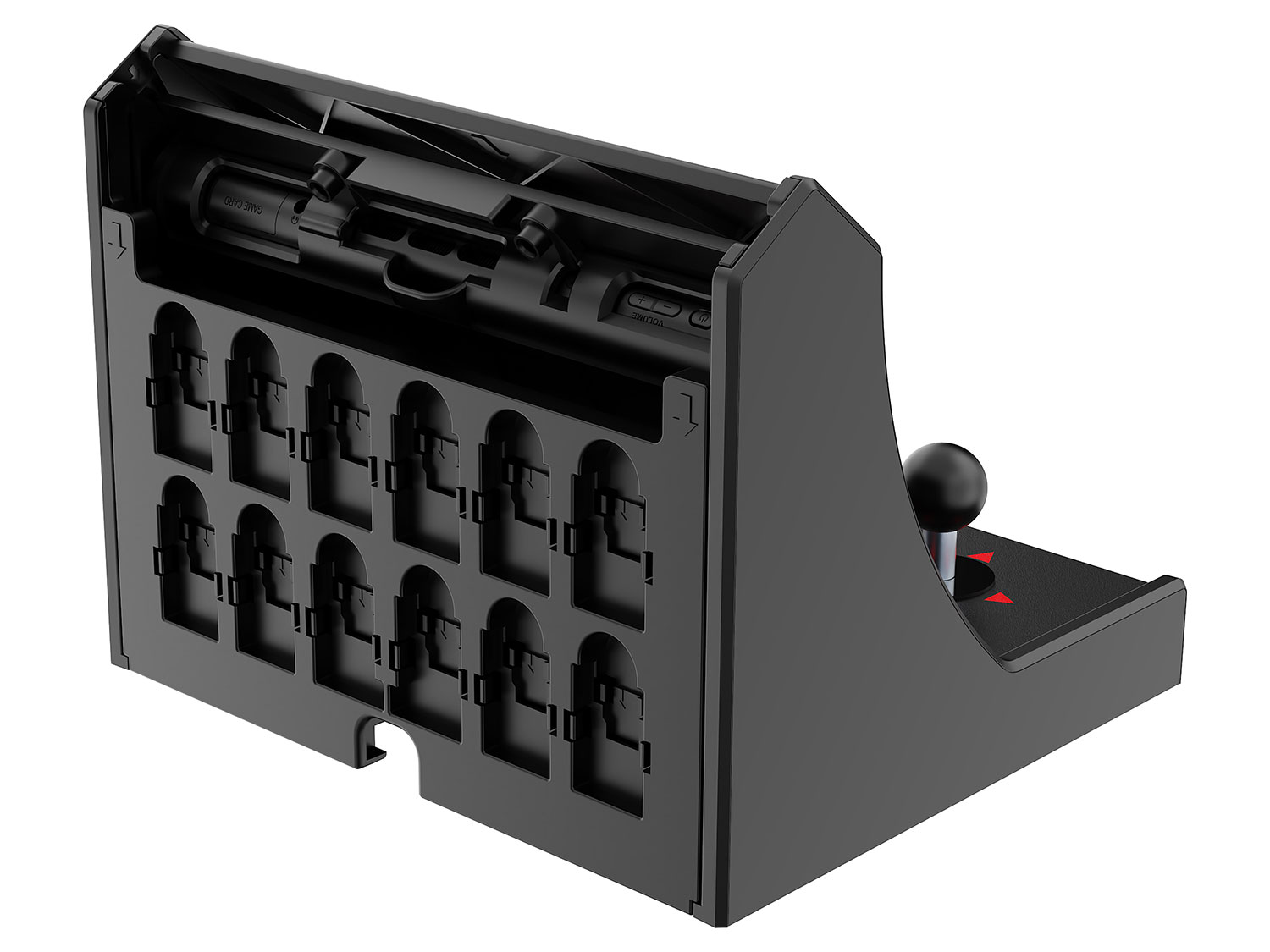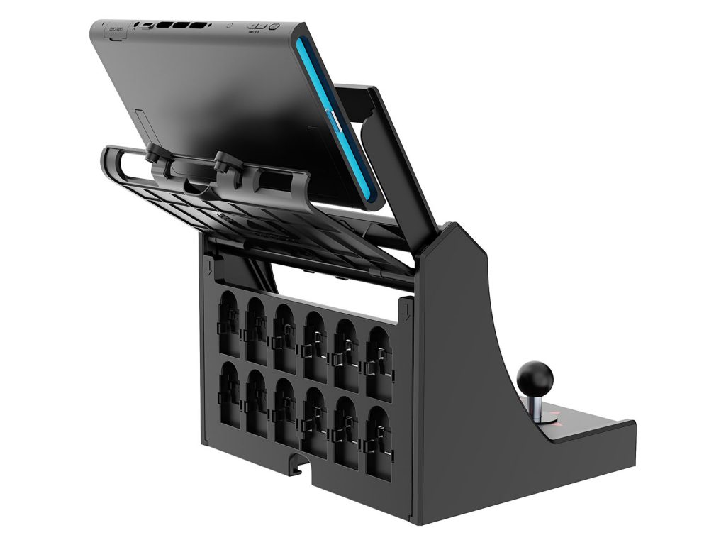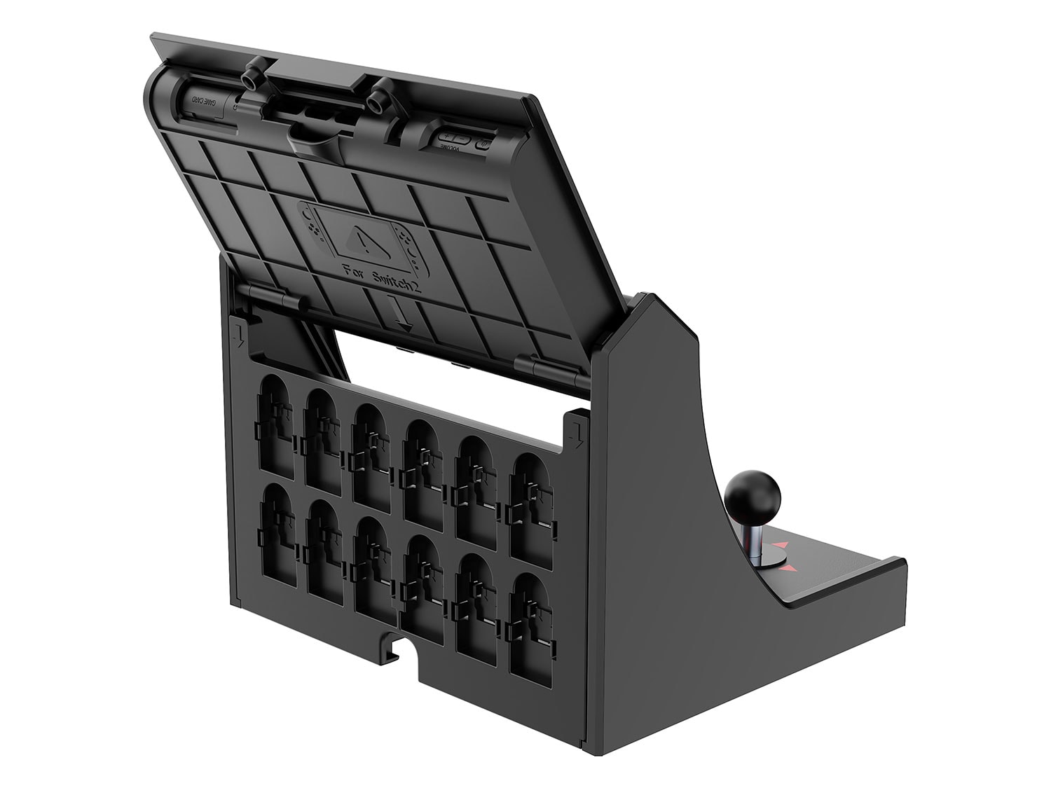 Nintendo Switch2、Switch有機EL、Switchの各種本体に対応した専用コンソールトレイが付属し、工具不要で簡単に組み立て・装着が可能で、ゲーム機本体と接続するType-Cコネクターのほか、底面には充電用Type-Cポートがあり、背面パネルにはゲームカード/micro SDカードを12枚収納できるホルダーも備わっています。