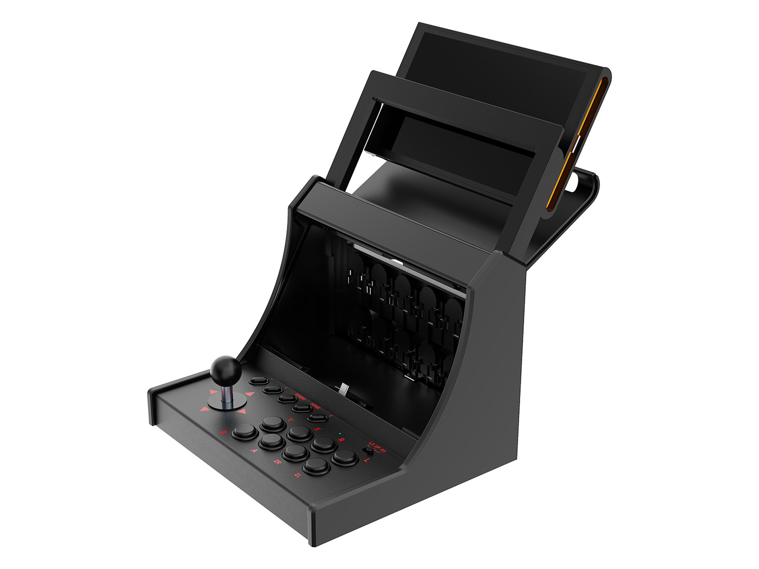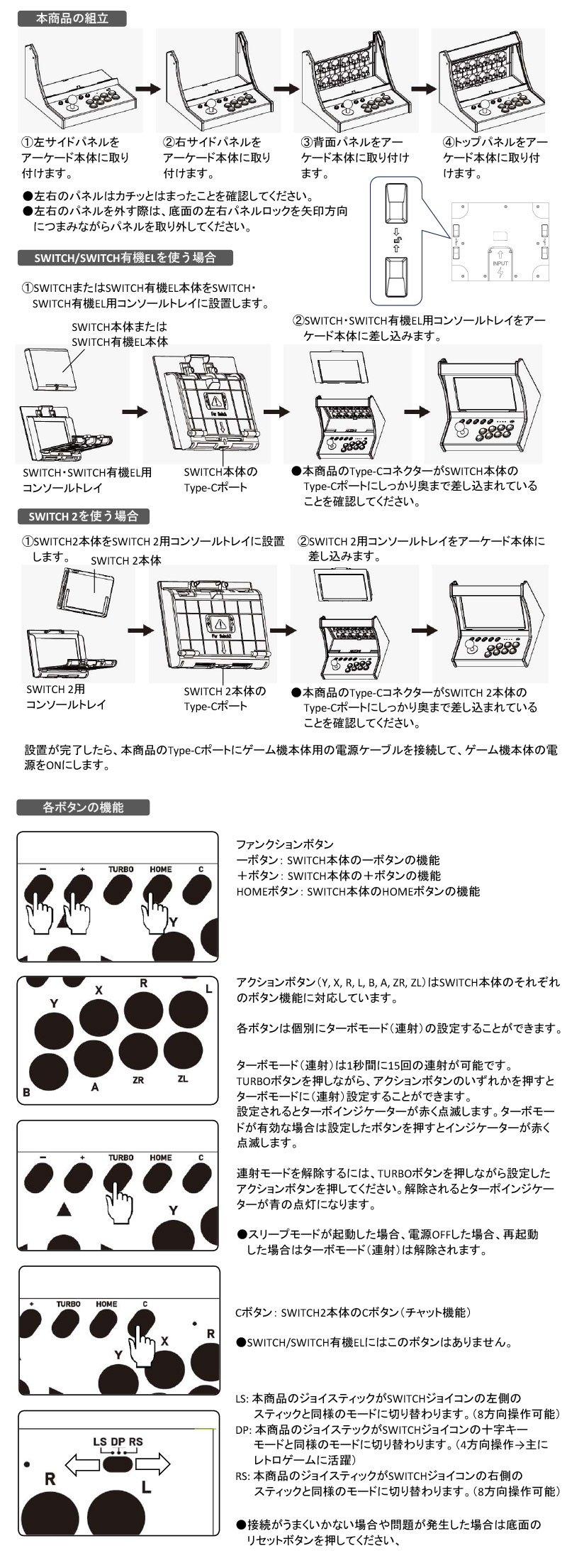 本格的な操作感を提供するアーケードジョイスティックと8個のアクションボタン(Y、X、R、L、B、A、ZR、ZL)を搭載し、ジョイスティックの動作モードを「左スティック(LS)」「十字キー(DP)」「右スティック(RS)」に切り替え可能なLS/DP/RSモードスイッチを備えているほか、アクションボタンは個別にターボモード(1秒間に15回の連射)を設定可能で、SWITCH 2本体のCボタン(チャット機能)にも対応した専用ボタンを搭載しています。