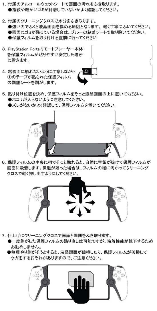 型番 GRFD-PS5P_PF01-G 商品名 PS Portal用 液晶保護フィルム 強化ガラス(光沢クリア) JANコード 4582794733273 対応機種 PlayStation Portal 厚さ 0.33mm 硬度 9H 透過率 約90% ブルーライト遮断率 - 付属品 アルコールウェットシート×1、クリーニングクロス×1、粘着シート×1 取扱説明書 〇 保証期間 - 発売日 2025年07月24日 商品カタログダウンロード取扱説明書ダウンロード - 使用方法