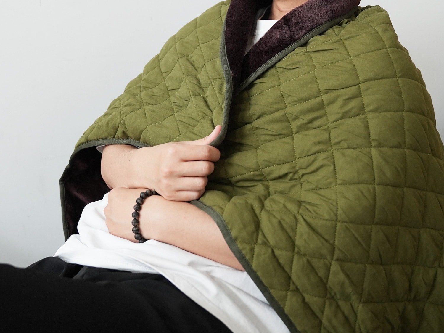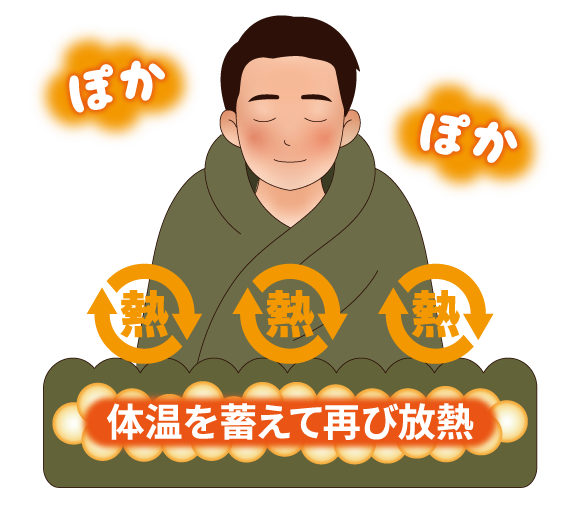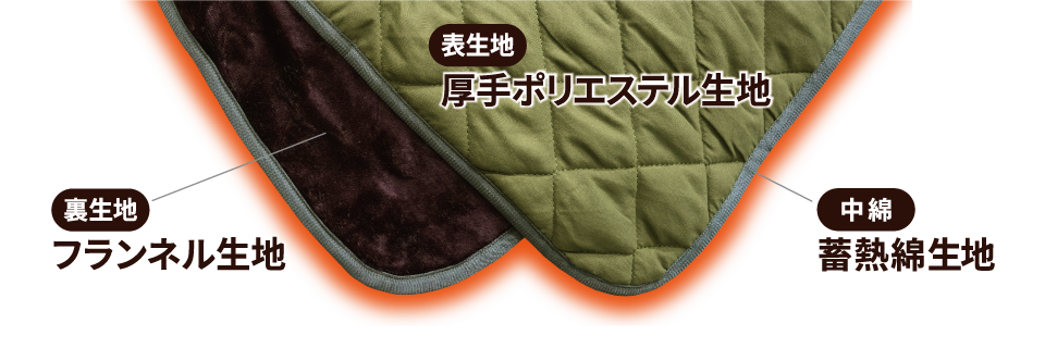 暖かさの秘密は、厚手ポリエステル生地(表生地)、蓄熱綿生地(中綿)、フランネル生地(裏生地)の3層構造です。電熱や赤外線などのように、外から与えられるものではなく自分の体温を蓄えて再び放熱し暖めるので、自然で優しい使い心地です。お使いいただく皆様が疲れたり、電気代がかかったりの心配を少しでも取り除いていただくために企画された商品です。
