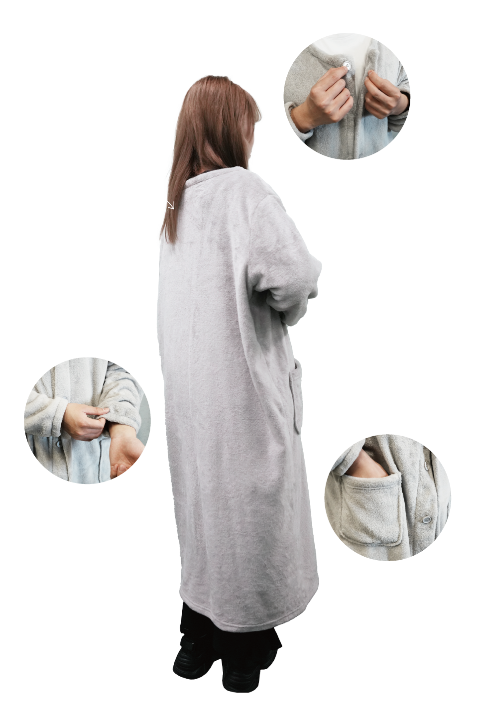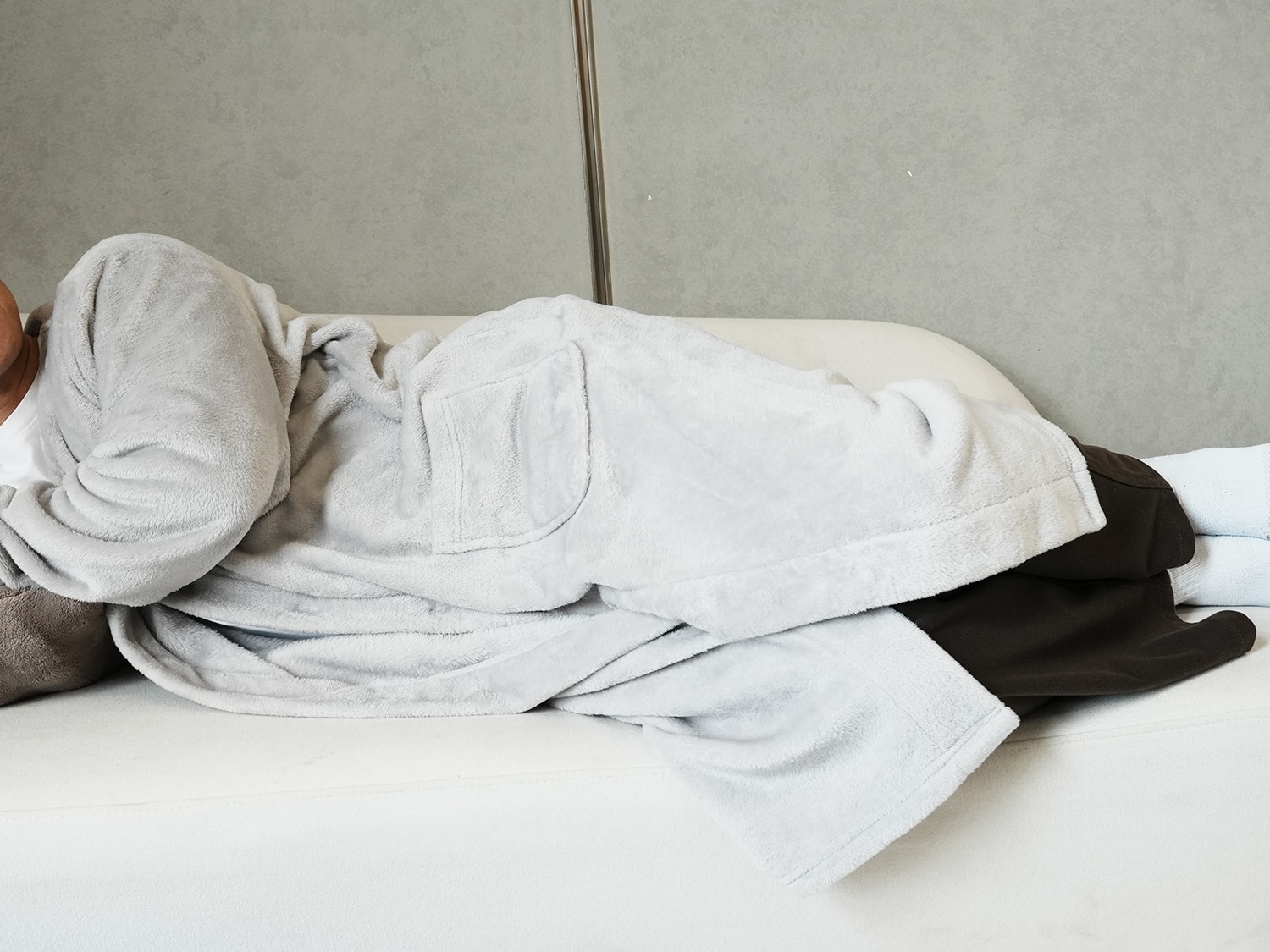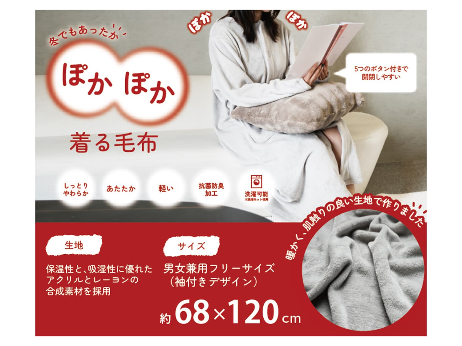 袖付きデザインのため動きやすく、着たままくつろぐことができます。お昼寝の際には毛布がわりに使用することもできます。男女兼用フリーサイズで、家族のシェアも可能です。