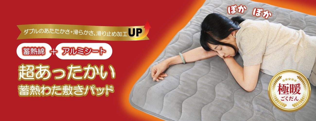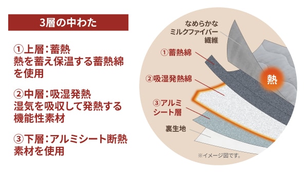 熱を蓄え保温する蓄熱綿とアルミシートを使用した、ダブル使いであたたかな寝心地をサポートします。